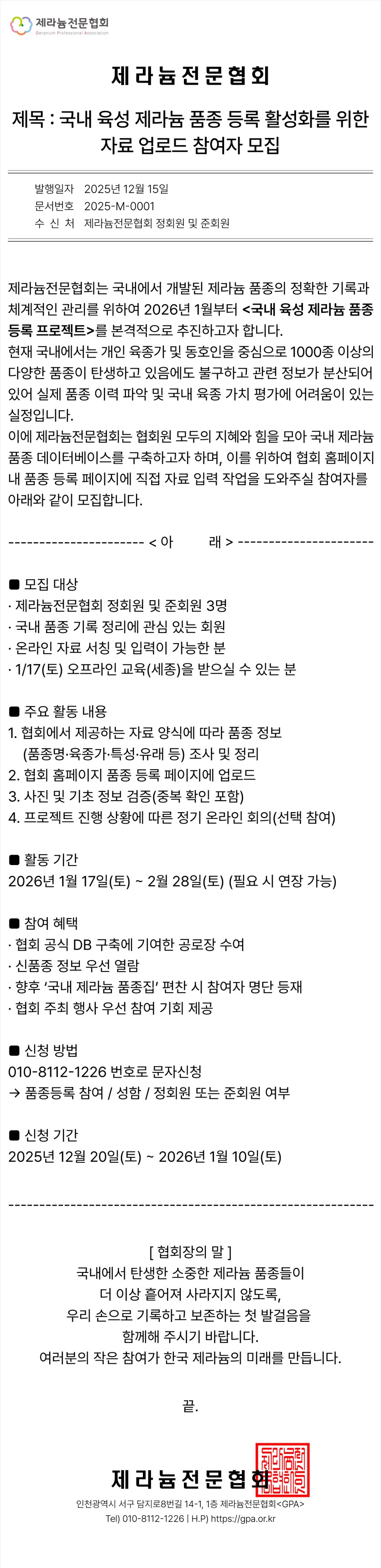 제라늄전문협회에서 2026년부터 K-제라늄 등록의 체계화를 위하여 본격적으로