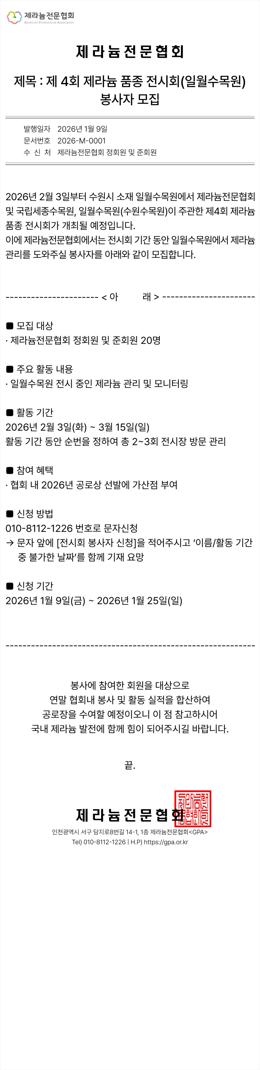 [마감] 제 4회 제라늄 품종 전시회(일월수목원)봉사자 모집 (26년 1월 9일 ~ 25일)